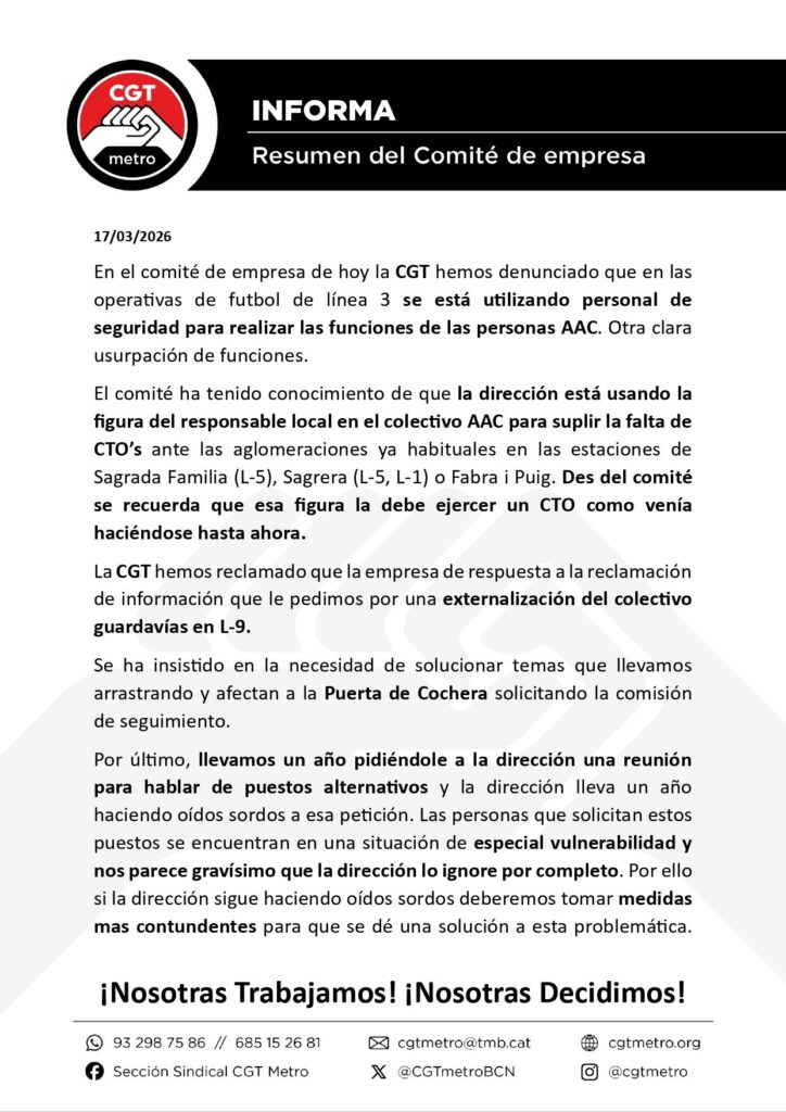 Comitè d’empresa 17/03/26CGT Metro18/03/2026AAC, CGT Informa, Comite de Empresa, Porta Cotxeres, Vias