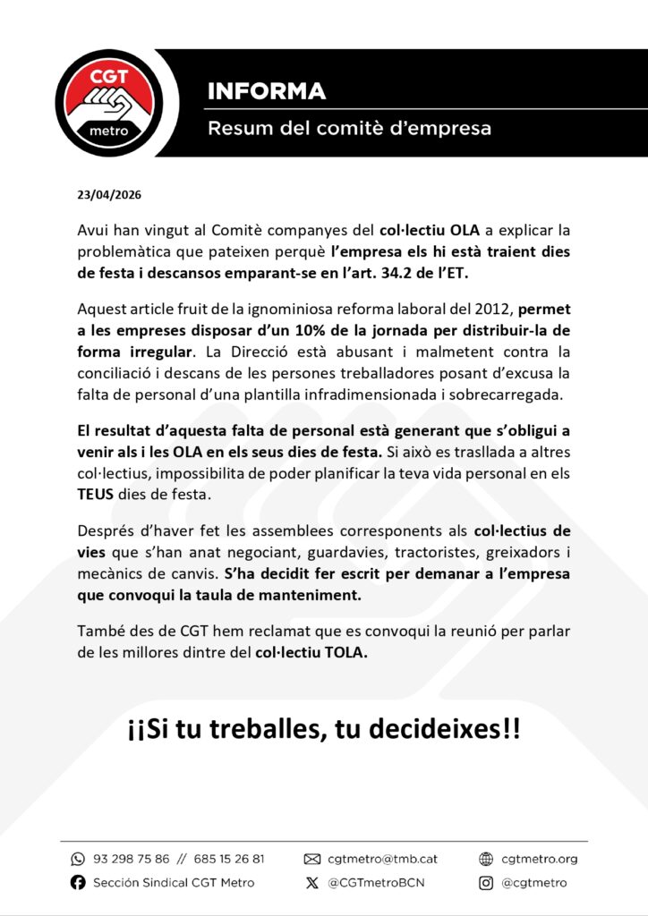 Comitè d’empresa 23/04/26CGT Metro24/04/2026CGT Informa, Comite de Empresa, Manteniment, OLA, TOLA, Vias