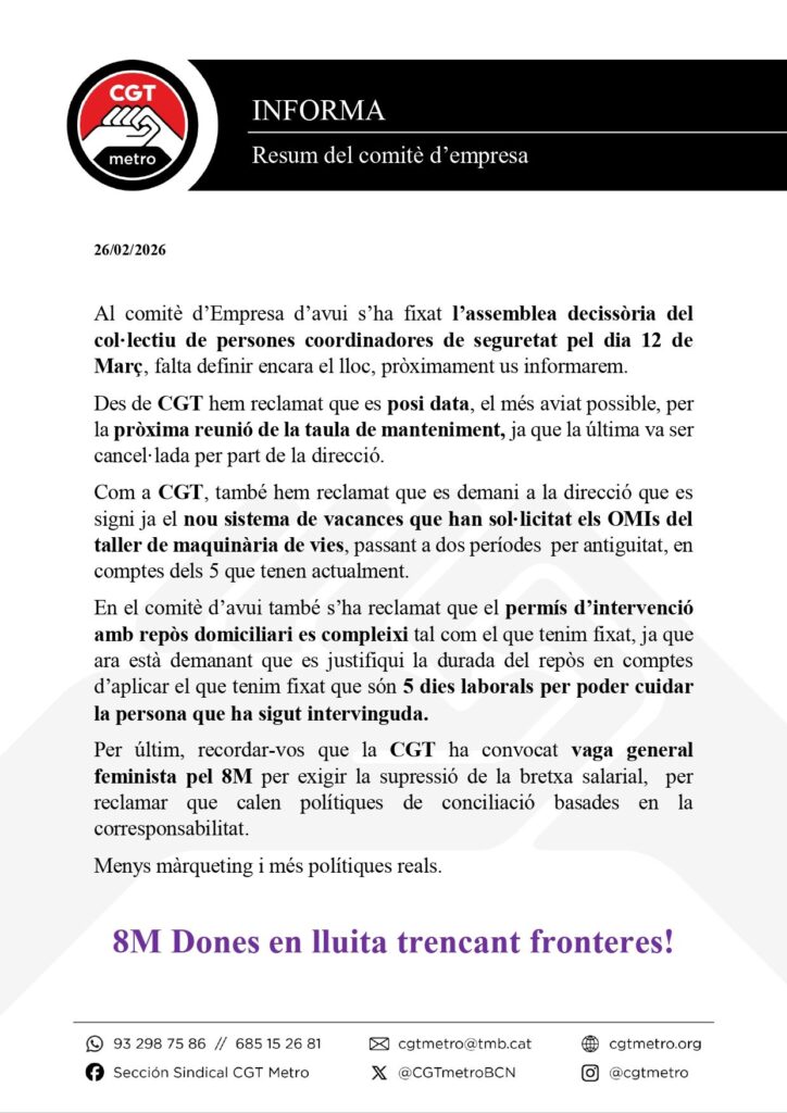 Comitè d’empresa 26/02/26CGT Metro27/02/2026CGT Informa, Comite de Empresa, CSPS, Manteniment, Permisos, Vias